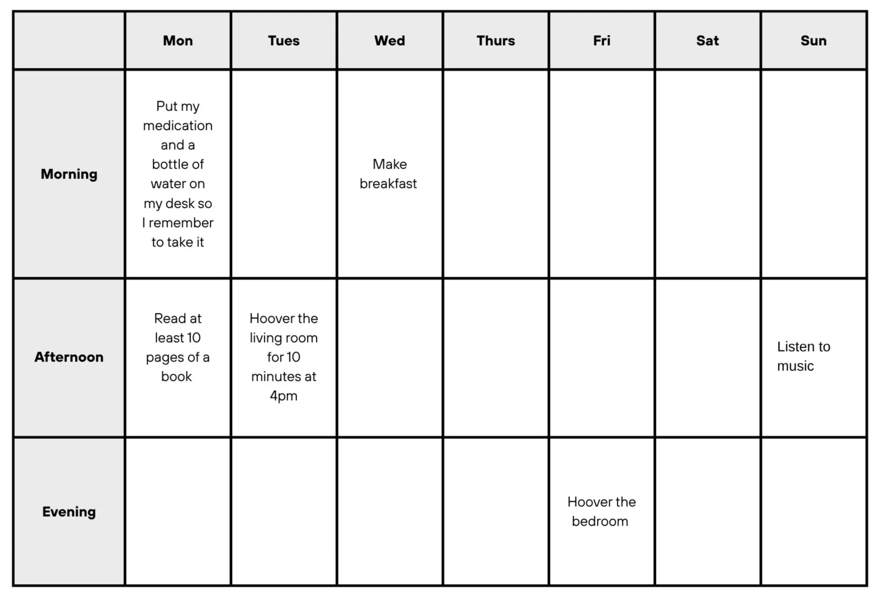Another important discussion to have with the patient at this stage is on how to break down tasks into smaller and more manageable chunks. This is to make difficult activities much easier to achieve. A common example of this I see in practice is when a patient has put on their list they need to “clean the house”. I don't know about you personally, but even on a good day I would struggle to clean my whole house. It sounds obvious to break things down and to only clean one section at a time. But when a patient is depressed, their problem solving skills can be diminished (see the section on problem solving); and patients can often attempt to over achieve when planning in and underachieve in practice. Having “clean the cupboards in the bedroom” on their list rather than “clean the house” can make all the difference in a patient following through or looking at a large task and becoming demoralised.