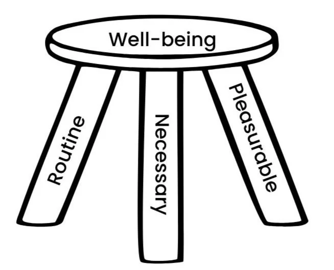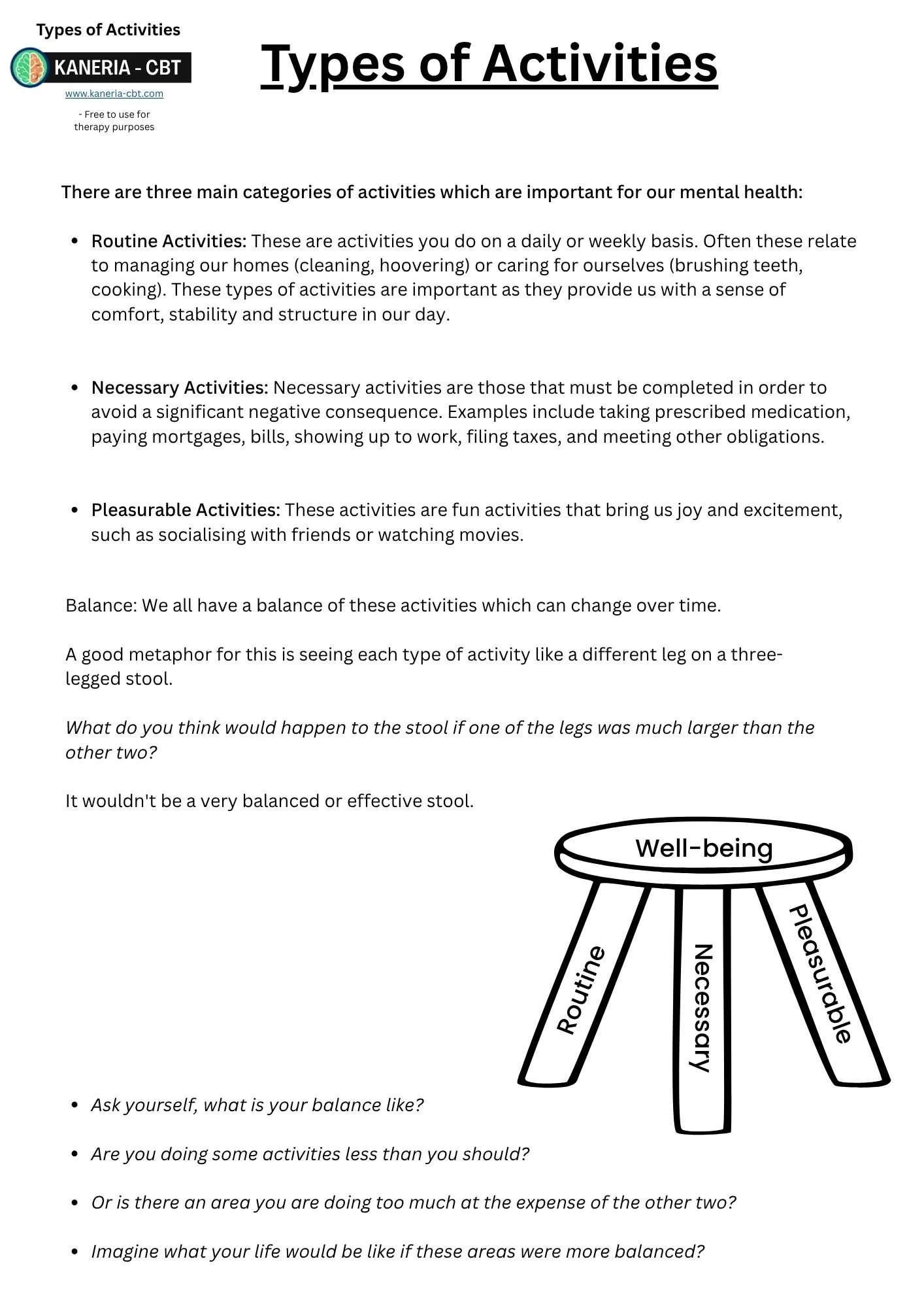 Three legged stool metaphor: Get the patient to think of these three types of activities as the legs on a stool. Ask them what they think would happen if one of the legs is smaller than the other. It would fall over or not be very stable. The same applies when having an imbalance of activities in life. Imagine the stereotype of a person who spends all day on his PC gaming and watching TV. Although they are doing pleasurable activities, they are missing out on doing their routine and necessary activities and may feel depressed. Alternatively, imagine a single parent who has three young kids and is working full time. They may be managing with all the routine and necessary items but never have any time for themself. They are also at risk for depression. The idea is to get a balance between the three activity types. Then ask the patient if they think any of their “stool legs” (types of activities) in their life are out of balance.