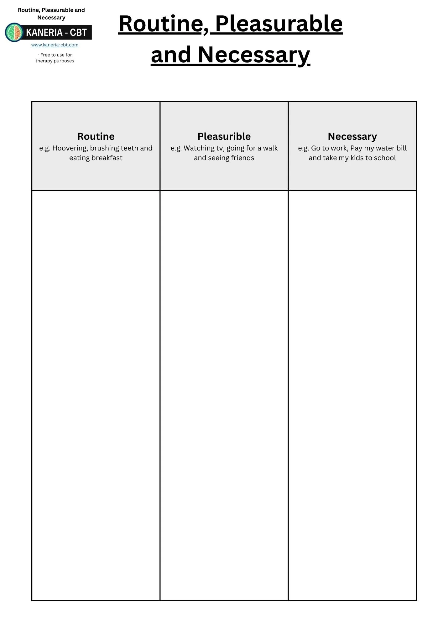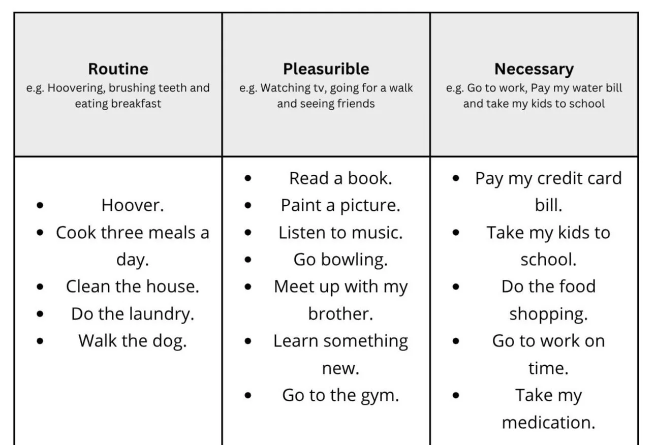 Step 3: Create a list of routine, pleasurable and necessary activities:
