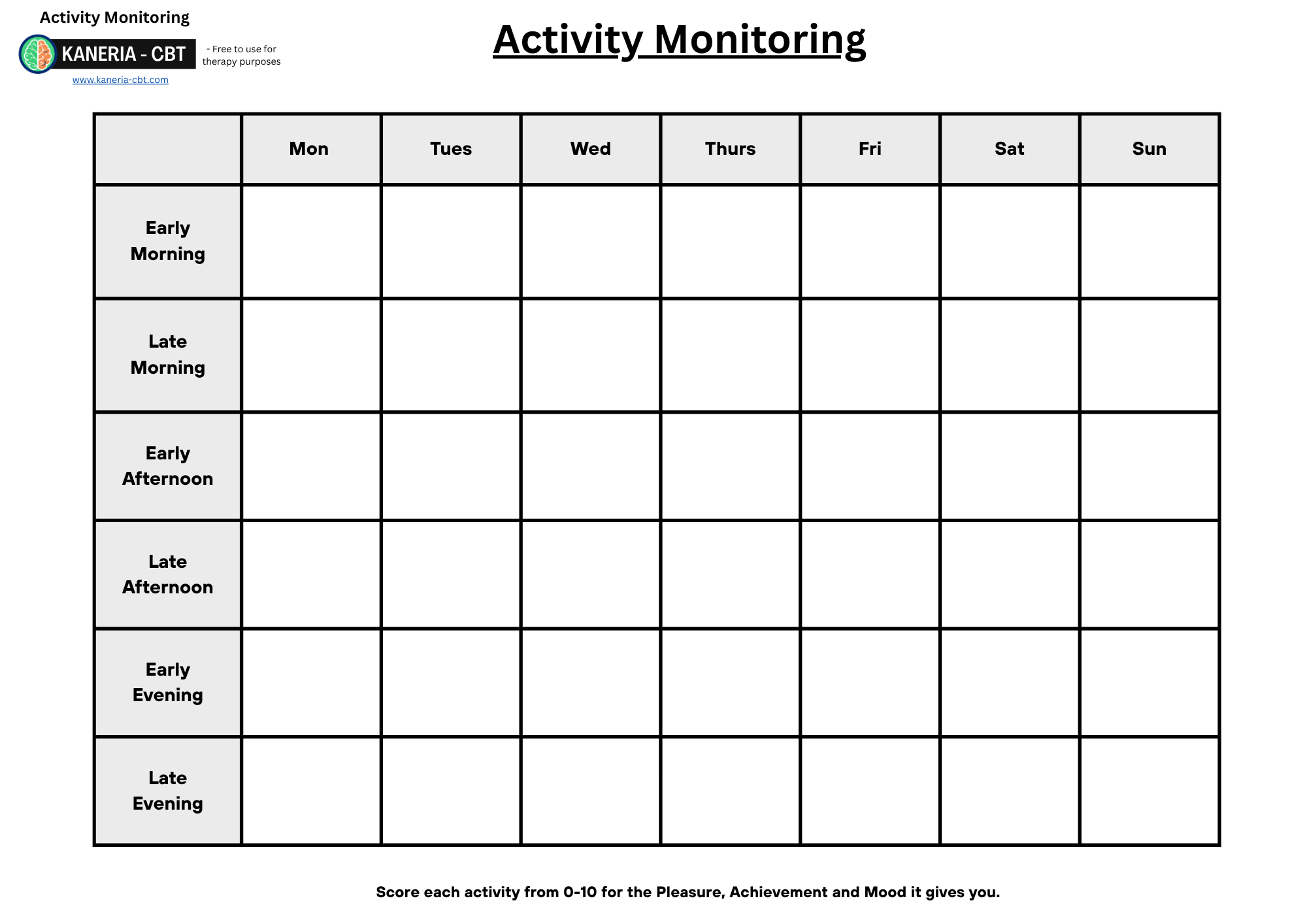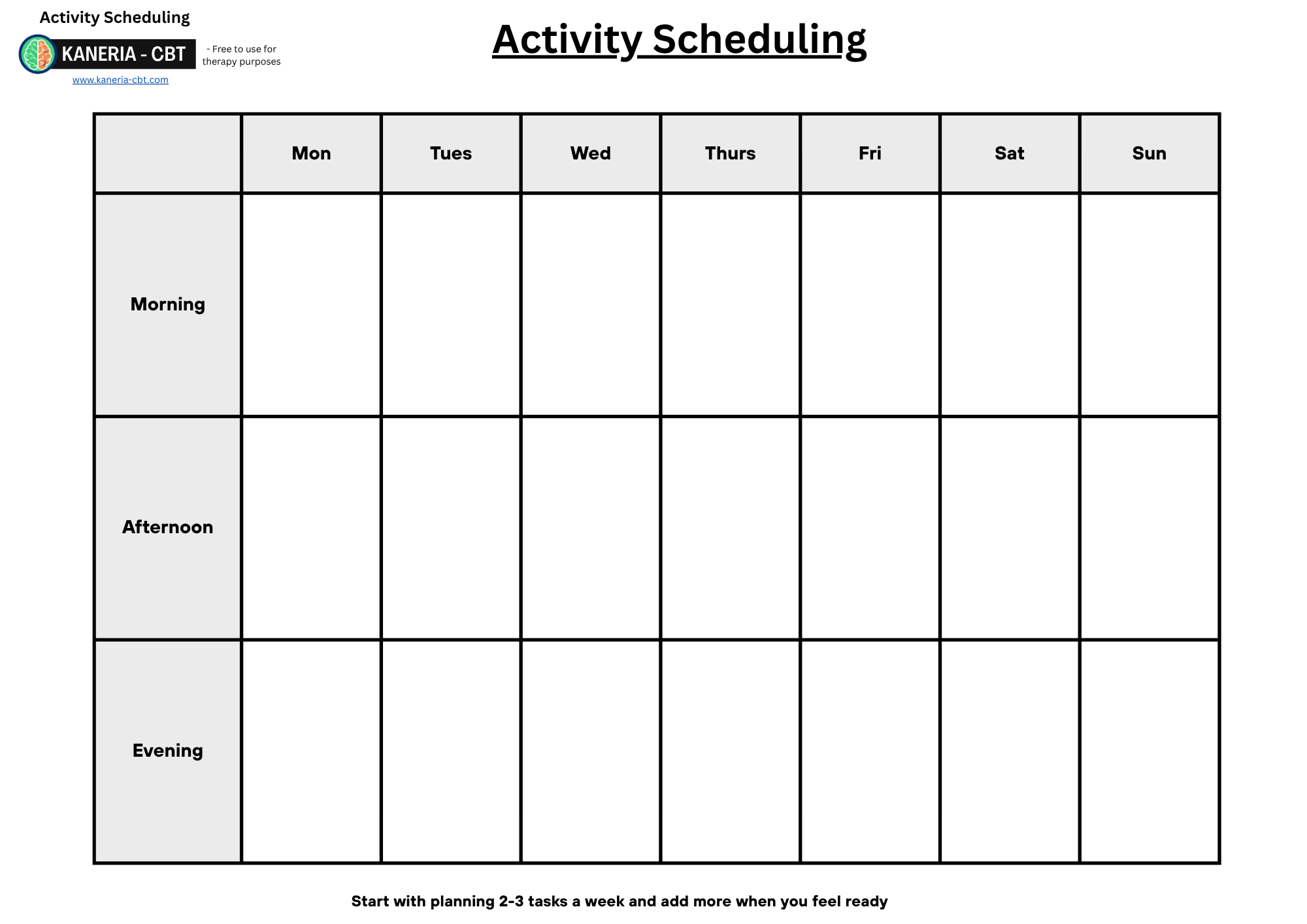 An activity schedule should be used. There are many versions of activity schedules, which range from hour-by-hour time blocks to more less detailed dairies. Use whatever feels most relevant to your patient.
