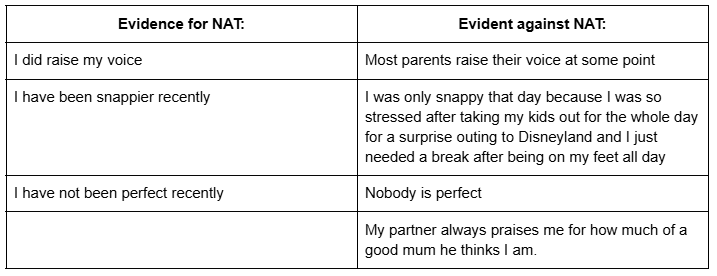 Patients' evidence is likely to be distorted. One of the pieces of evidence used was “I did raise my voice” which is factually true. However, does it actually support the NAT of “being a bad mother” as much as the patient feels it does? Is everyone who raises their voice automatically a bad parent? You can get patients to tear down their evidence for their NAT by asking themselves a few simple questions such as: