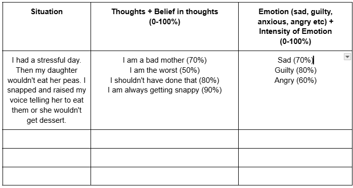 “I am a bad mother” and be replaced with “I am not a bad mother for raising my voice. Occasionally, even good mothers shout at their children when really stressed”.
