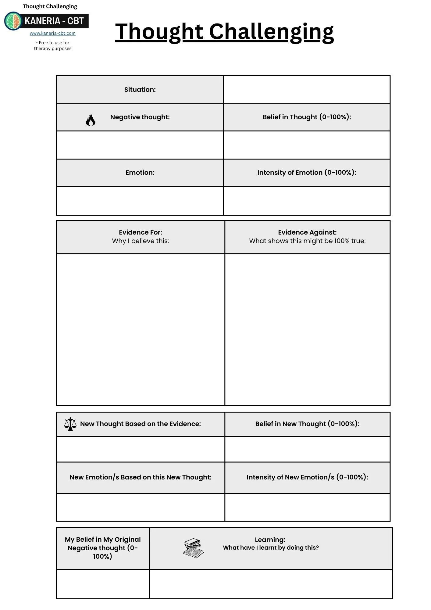 Belief in thought (0-100%): The patient can rate how much from 0-100% they believed this NAT. This helps identify the hot thought and is also used later when challenging the thought. It also helps reinforce the idea that thoughts are not facts and are subject to change.