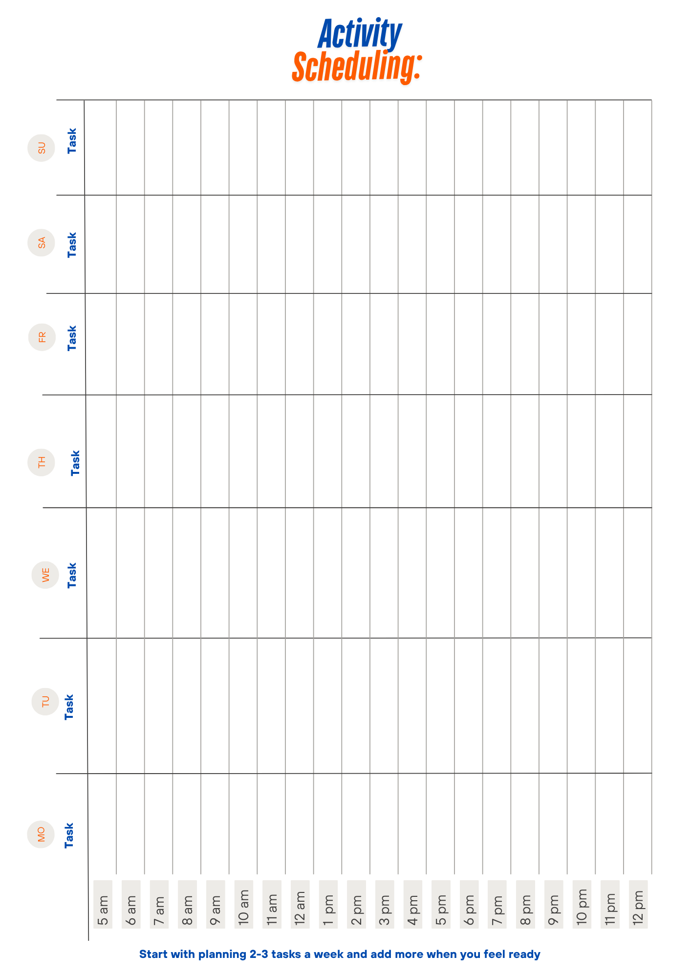 Spread out activities: Do not plan everything too close together. Give yourself breaks. You also do not need to plan every moment of every day. Just add a few activities a week to start.